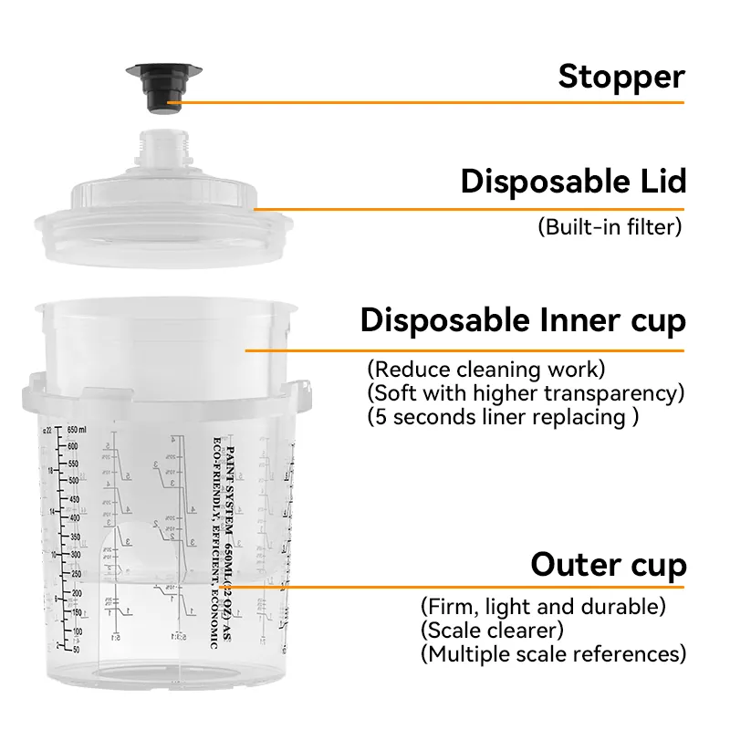 Rispetto alla tradizionale serie 1.0, la tazza di pistola a spruzzo usa e getta AYS3.1 presenta un design a tazza esterna migliorata con una finestra di ritaglio aggiuntiva, consentendo agli spruzzatori di monitorare facilmente la vernice all'interno della tazza. La progettazione di blocchi integrata semplifica le variazioni di coppa e migliora significativamente l'efficienza di spruzzatura.