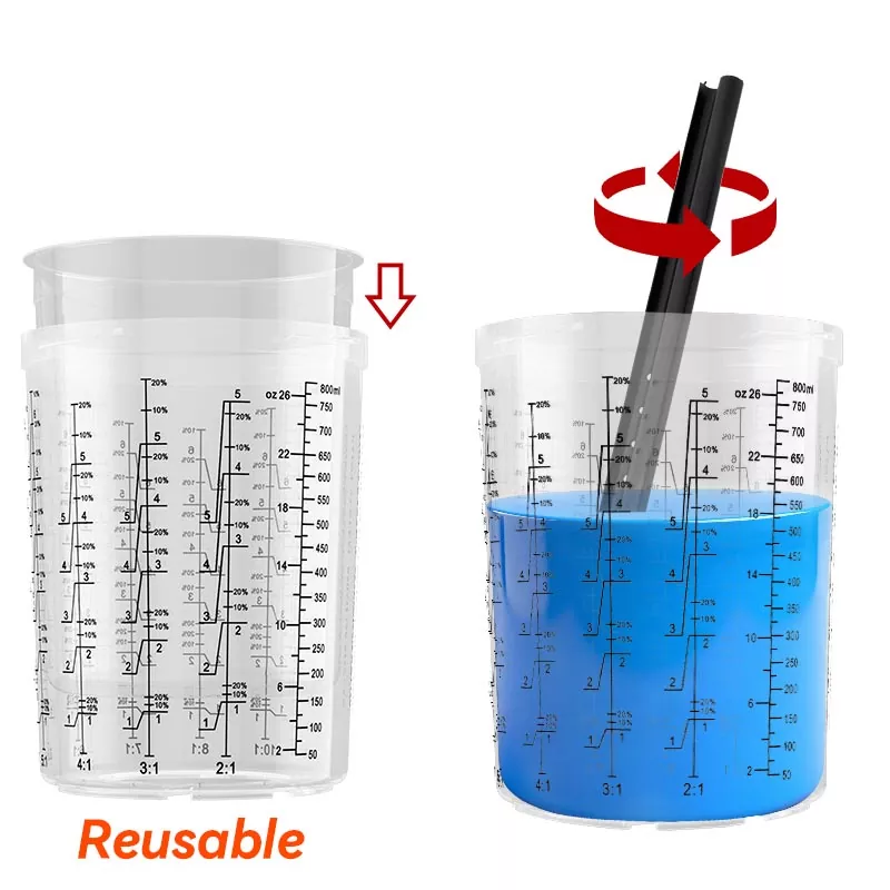 Tazza esterna riutilizzabile con scala del rapporto di miscelazione. Inserisci il rivestimento usa e getta nella tazza esterna e mescola la vernice direttamente nel rivestimento. Riduci il costo del materiale evitando di utilizzare una tazza di miscelazione tradizionale.