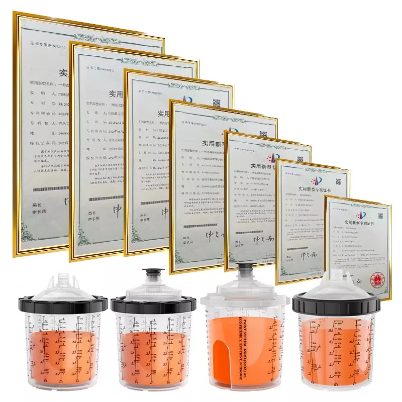 Il sistema di tazze spray usa e getta AYSPAT è composto da cinque parti: una tazza esterna con una scala, un rivestimento monouso in PE, un coperchio con filtro, un collare che collega la tazza e il coperchio e un tappo con una base. Questo sistema combina molteplici funzioni come la miscelazione, il filtraggio, la spruzzatura, lo stoccaggio della vernice, semplifica il processo di pre-preparazione per la verniciatura a spruzzo e consente di risparmiare sui costi di acquisto di imbuti di carta e tazze di miscelazione della vernice separati.