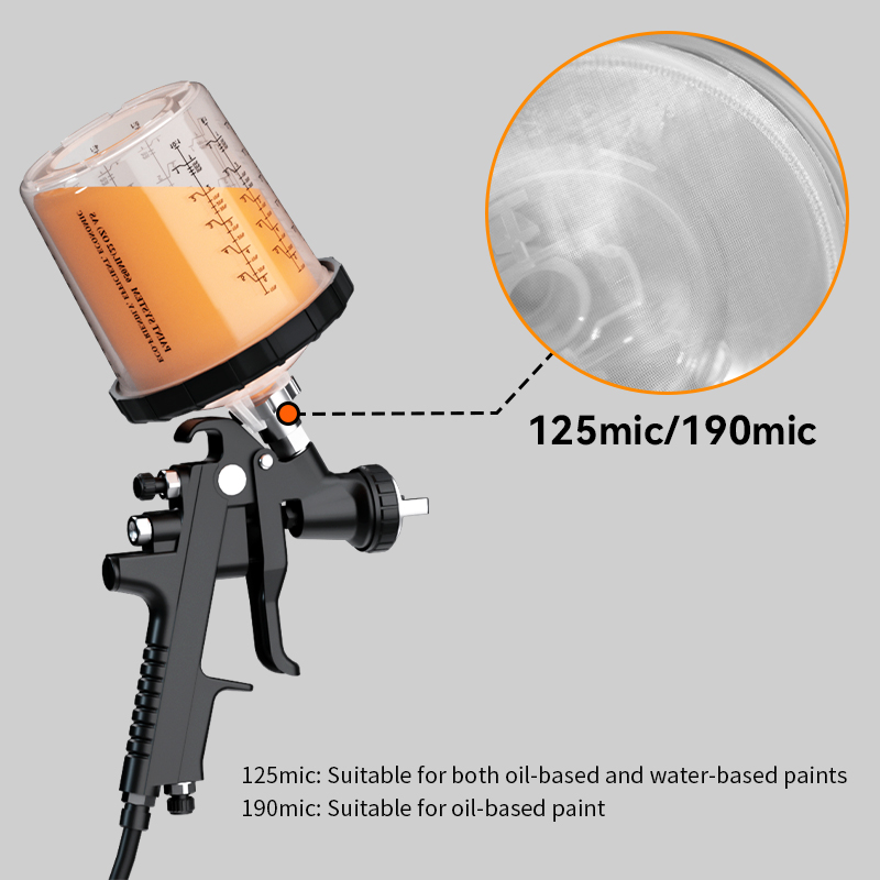 • Filtri integrati incorporati per una finitura della vernice superiore: Il tappo della tazza spray usa e getta è dotato di filtri integrati da 190μ (vernice a base di olio) e 125μ (vernice a base d'acqua), che filtrano efficacemente le impurità durante la spruzzatura e aumentano la brillantezza della vernice del 20%.